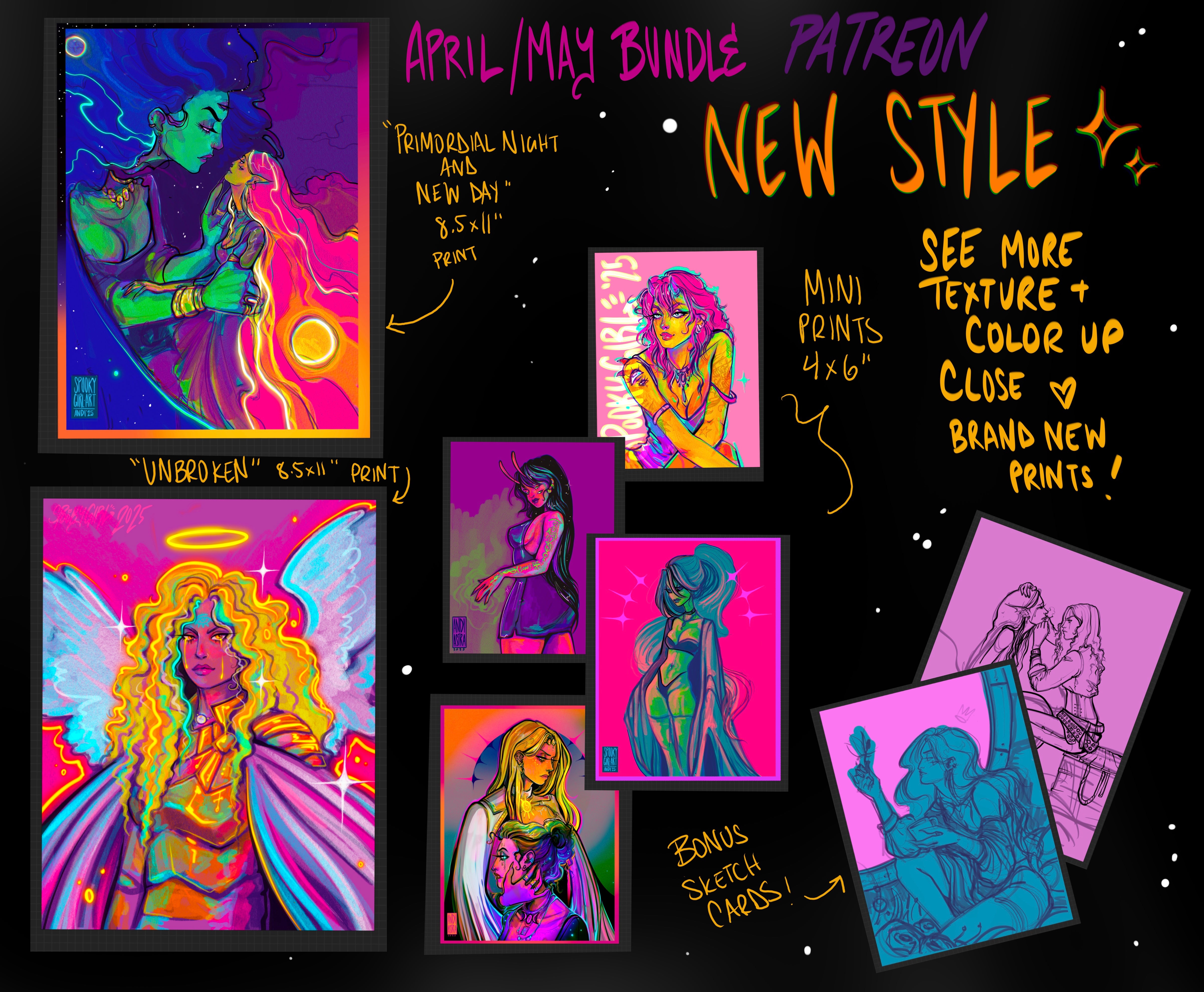 Purchase the Patreon Print Bundle for April/May featuring Andi's new style, showcasing intricate textures and vibrant colors up close.